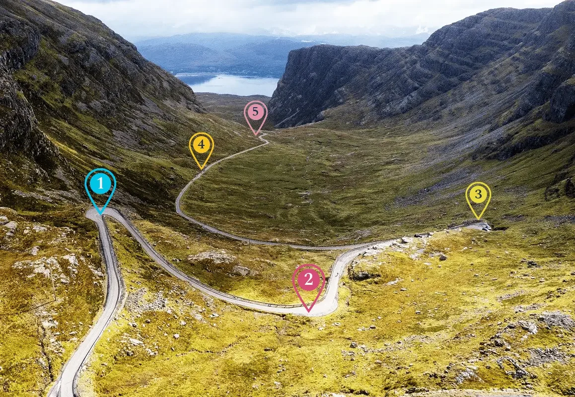 Winding mountain road with numbered markers from 1 to 5, surrounded by grassy and rocky terrain, with mountain cliffs on either side and a lake visible in the distance.