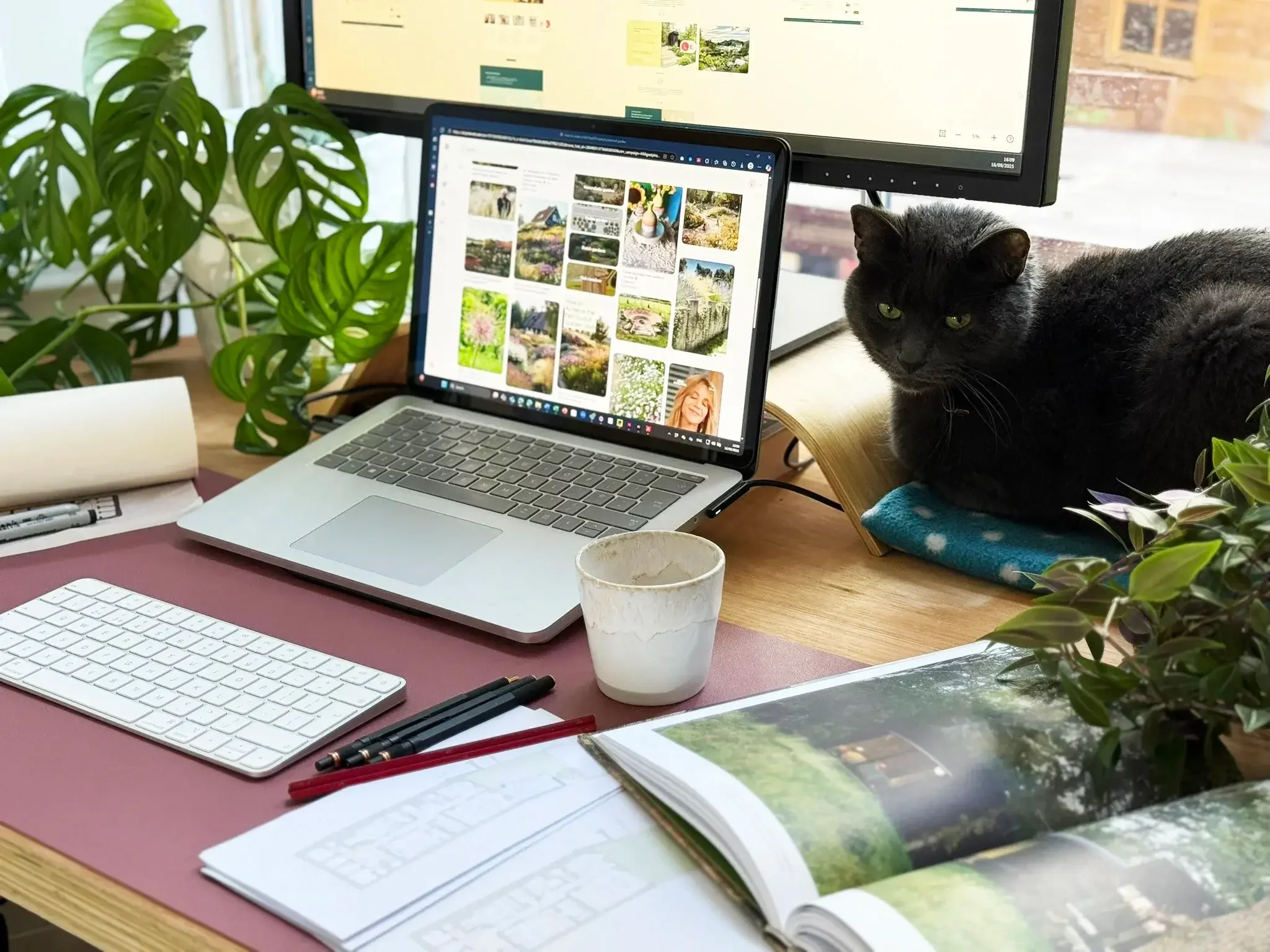 A workspace with a laptop, two monitors, a wireless keyboard, pens, a notebook, a plant, a cup, an open magazine, and a black cat sitting on a book near a window.